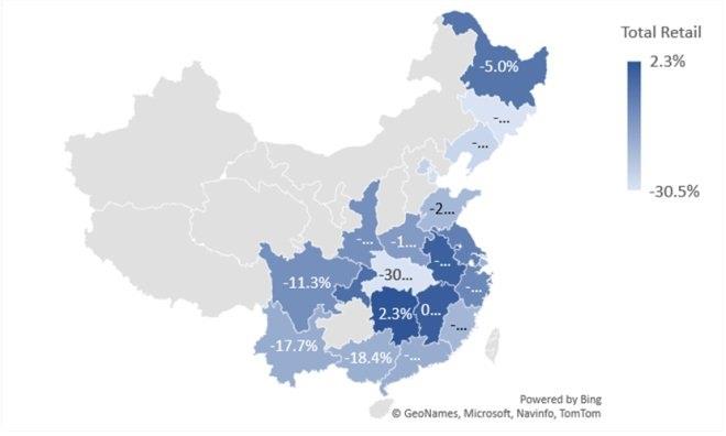 與上月相比,總體零售和服飾零售都有積極的增長,同比分別增長了31.6%和39.5%,零售消費(fèi)勢頭繼續(xù)保持良好趨勢。