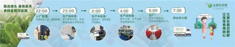 在活動現(xiàn)場,彩食鮮借助展板,向家?生動地呈現(xiàn)了這一概念:以時間為軸線,列舉了從食材入廠到配送至幼兒園的每一步,具體展示了彩食鮮的檢驗流程。