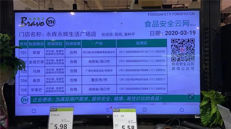 “現(xiàn)在到永輝來買菜,都習(xí)慣抬頭看看這塊屏幕,看了這些信息感覺很放心?!睋?jù)了解,截至2019年底,永輝超市已在全國門店啟用了1374塊“食品安全云屏”。通過這些“食品安全云屏”,消費(fèi)者可以查看當(dāng)日上架銷售的農(nóng)產(chǎn)品包括檢測商品、檢測項(xiàng)目、檢測結(jié)果、產(chǎn)地、追溯碼等公示信息。