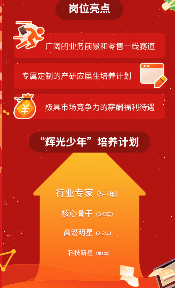 上述負(fù)責(zé)人表示,除了極具市場競爭力的薪酬福利待遇,永輝也為產(chǎn)研應(yīng)屆生推出了專屬的“輝光少年”計(jì)劃,其中第一年為“科技新星”階段,將分配經(jīng)驗(yàn)豐富的導(dǎo)師指導(dǎo),輔助新員工了解業(yè)務(wù)、走進(jìn)崗位。入職第二年后,員工將逐漸進(jìn)入“高潛明星”、“核心骨干”、“行業(yè)專家”階段,整個(gè)晉升周期約為5-7年,在不同階段的薪酬待遇和職級穩(wěn)步提升。