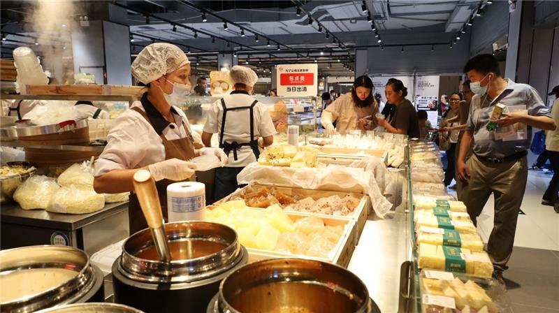 過去,不少顧客對(duì)永輝的印象更多聚焦在生鮮產(chǎn)品上,但現(xiàn)在,像奈雪的茶、張一元、瑞幸、美心、煌上煌、絕味這些熱門的品牌都出現(xiàn)在了公園道店的貨架上,選品更時(shí)尚,更多元。在‘老本行’生鮮方面,保留了部分顧客認(rèn)可度高的商品,也增加了M5級(jí)別的安格斯牛肉、俄羅斯進(jìn)口的帝王蟹等“新寵”。除了商品的調(diào)整,公園道店還有了更多“煙火氣”。門店入口處增加了特色烘焙區(qū),6名烘焙師現(xiàn)場(chǎng)制作,推出了黑芝麻貝果、紅茶奶酥等烘焙產(chǎn)品。新增了“永輝食堂”,不僅能夠?yàn)轭櫩同F(xiàn)場(chǎng)加工部分生鮮產(chǎn)品,還提供撈化、缽缽雞、輕食、鹵味、麻辣燙、炸串、壽司等等餐飲選擇。門店還試點(diǎn)了當(dāng)下流行的“海鮮自助”模式,顧客可以自由挑選裝盤的海鮮,豐儉由人。