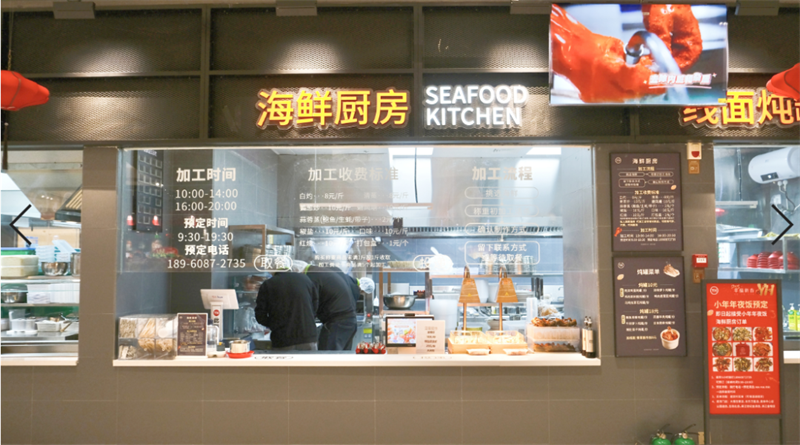 “海鮮加工檔口能解決大海鮮難烹飪的痛點(diǎn),消費(fèi)者可以現(xiàn)場(chǎng)選購(gòu),按照不同口味需求制作,支持堂食及打包,加工區(qū)透明的檔口設(shè)計(jì)也讓消費(fèi)者有了更強(qiáng)的交互感,在品味美食同時(shí)能觀摩加工的過(guò)程。我們希望通過(guò)將零售與餐飲相結(jié)合的方式,為消費(fèi)者提供一種全新的購(gòu)物體驗(yàn)。”門店相關(guān)負(fù)責(zé)人介紹道。